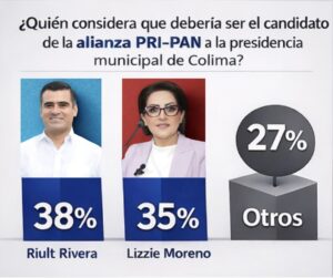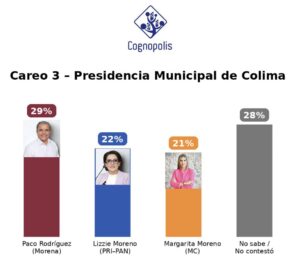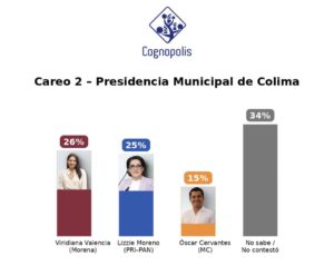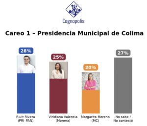 La casa encuestadora Cognopolis presentó resultados de su consulta de enero de la intensión del voto para la Presidencia Municipal de Colima en el 2027, donde Morena destacó como la opción más fuerte en las distintas posibilidades de perfiles que resultaron del estudio realizado.