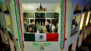 En la ceremonia del Grito, conmemorativa del 215 Aniversario del inicio de la Guerra Independentista de México, se contó con la Banda de Guerra de la Dirección General de Seguridad Pública, y en el Balcón de la Presidencia Municipal acompañaron a Tey Gutiérrez, regidores, regidoras, líderes sindicales y de cámaras empresariales y funcionarios y funcionarias municipales.