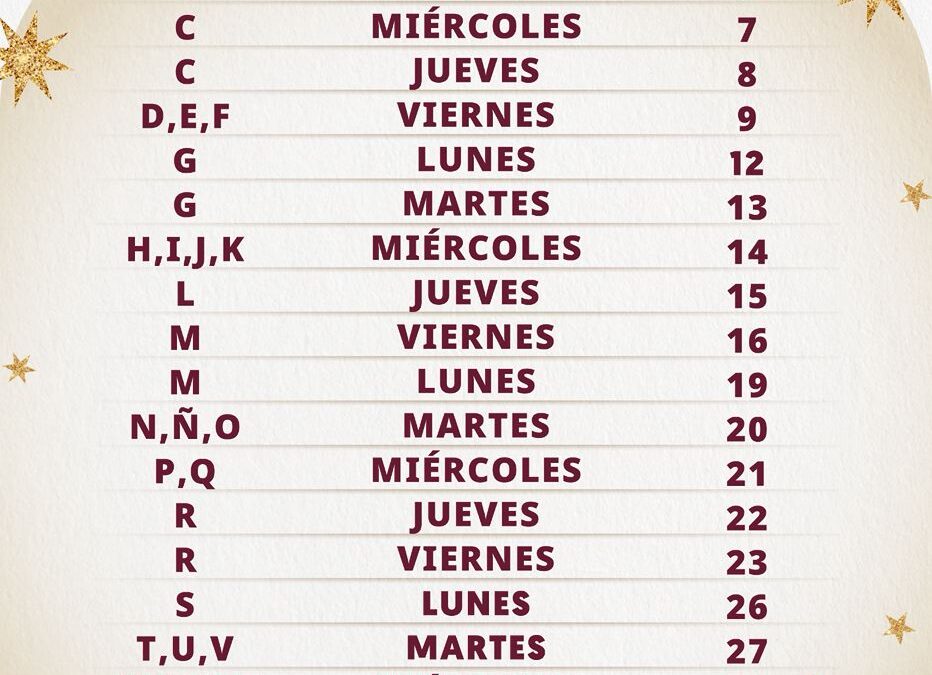 viernes 16 y lunes 19; N, Ñ, O martes 20; P, Q miércoles 21, R jueves 22 y viernes 23; S lunes 26; T, U, V martes 27; W, X, Y, Z miércoles 28 de enero.