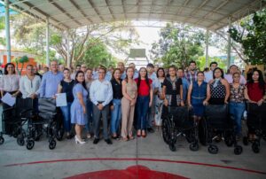 ++La mandataria colimense acompañó la entrega de 50 sillas de ruedas a primarias, secundarias y CAM de Villa de Álvarez, que realizó la Asociación Civil Gustavo Silva.