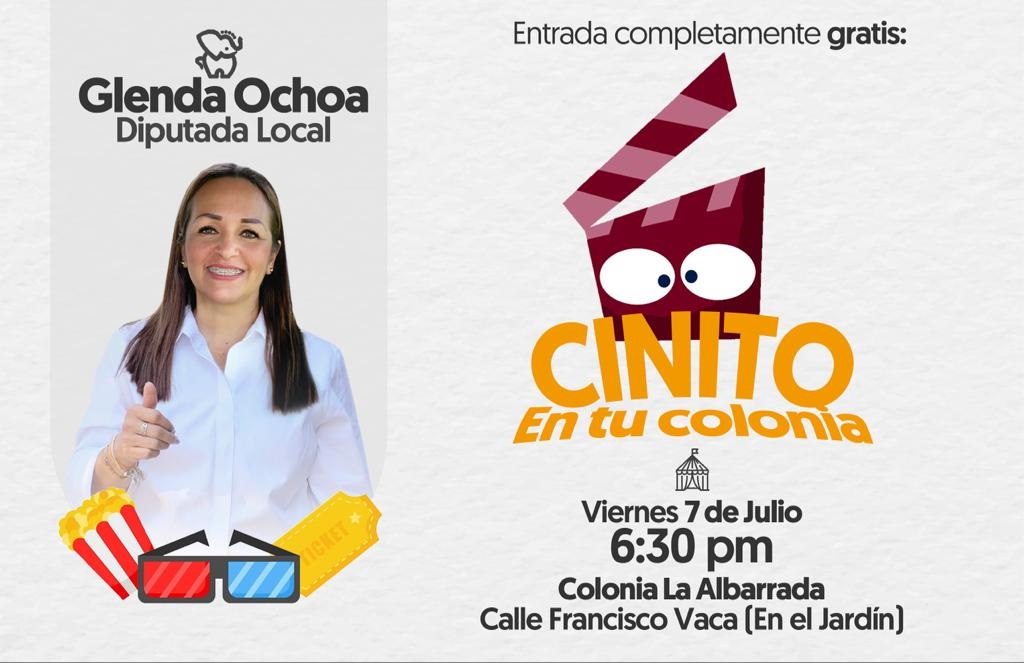 La diputada morenista Glenda Ochoa llevará a cabo este viernes por la tarde, el inicio de un nuevo proyecto: CINITO EN TU COLONIA, derivado del “Programa del Congreso a tu Colonia”, actividad que tiene como finalidad llevar la proyección de películas infantiles y clásicas para aquellas familias que no puedan acudir al cine, tengan al alcance del lugar donde viven un momento agradable para disfrutar una película y poder convivir con la familia, amigos y vecinos.