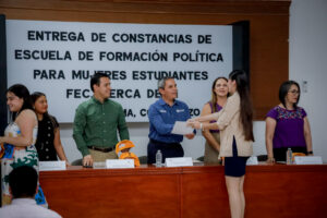 Este miércoles 11 de marzo, en el auditorio de la Federación de Estudiantes Colimenses, Christian Jorge Torres Ortiz Zermeño, rector de la Universidad de Colima, entregó las constancias que acreditan a las 40 mujeres estudiantes por su participación en la Escuela de Formación Política para Mujeres Estudiantes. Esta escuela tiene como objetivo fortalecer el liderazgo, la participación y formación política de estudiantes de nivel medio superior y superior de la Universidad de Colima.