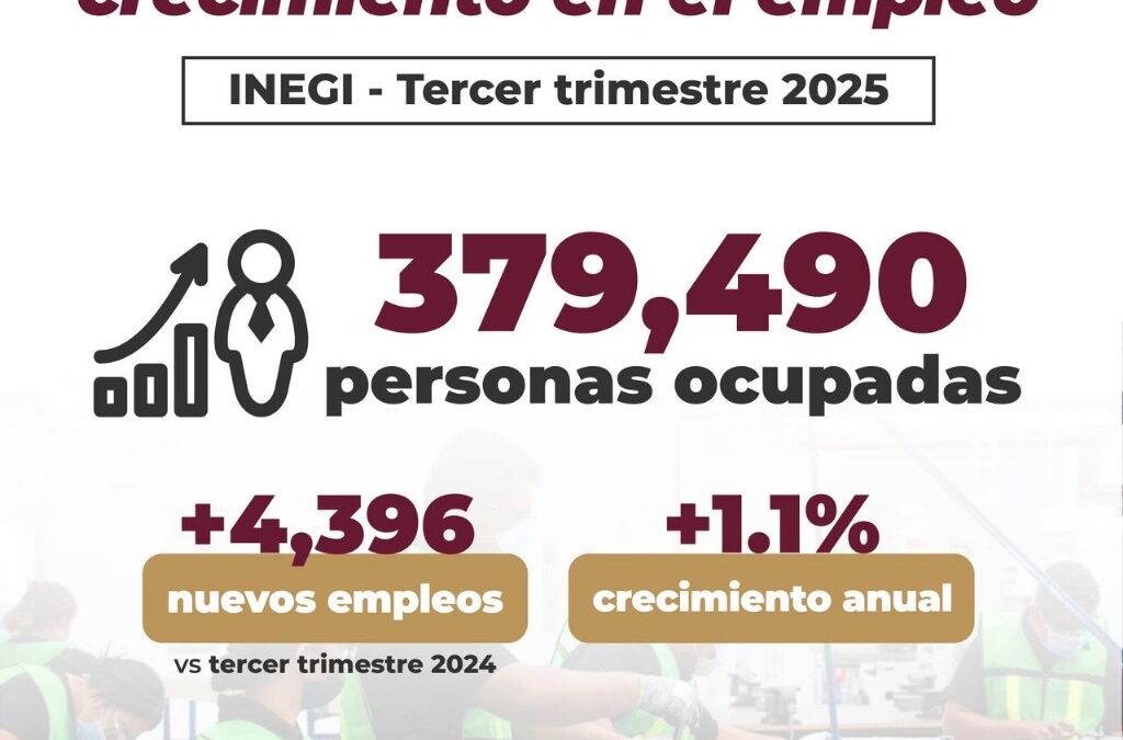 La Secretaría de Desarrollo Económico (Sedeco) del Gobierno del Estado de Colima informa que, de acuerdo con los datos más recientes de la Encuesta Nacional de Ocupación y Empleo –ENOE- que presenta el Instituto Nacional de Estadística y Geografía (Inegi), esta entidad alcanzó 379 mil 490 personas ocupadas durante el tercer trimestre de 2025.