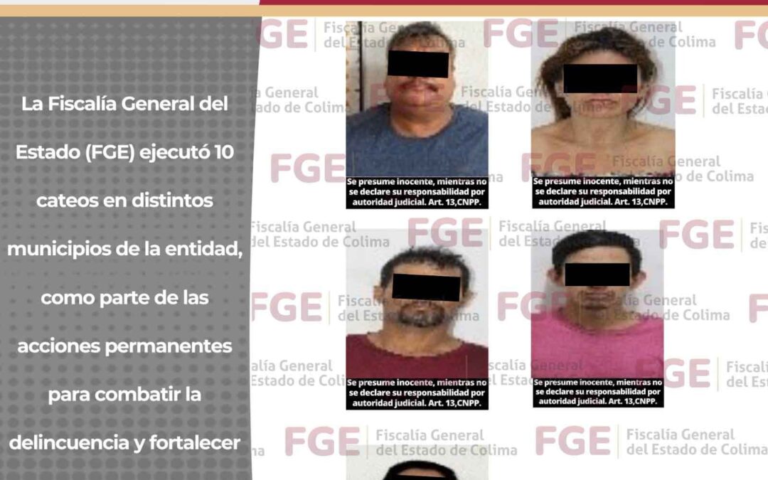 La Fiscalía General del Estado (FGE) ejecutó 10 cateos en distintos municipios de la entidad, como parte de las acciones permanentes para combatir la delincuencia y fortalecer la seguridad de la población colimense.