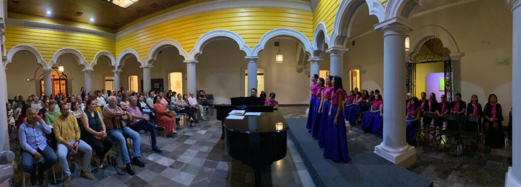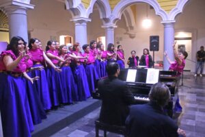 Con el concierto titulado “Letras de amor”, la agrupación Coral Femenina de la Universidad de Colima festejó, bajo la dirección de la maestra Agustina Murguía Nieves, sus quince años de trayectoria artística. Esto en la Pinacoteca Universitaria, en un encuentro que, además, contó con la presentación oficial del grupo Coral ACU, conformado por integrantes de la Asociación Colimense de Universitarias, así como de los pianistas invitados, Mario Alberto García y Jorge Hernández.