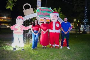 Al encendido del Árbol de Navidad y de las luces de los arreglos navideños en el Jardín Principal de Villa de Álvarez, asistieron Rogelio Cerca, Gerente de Publicidad de Progressa; Carla Robles, Gerente de Publicidad de El Bodegón;