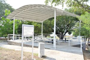 Esta obra consistió en la construcción de una techumbre de 61 M2 con comedores iluminados, diseñada especialmente para ofrecer un área de resguardo y comodidad a las personas que esperan en la vía pública a sus familiares que acuden a la clínica de hemodiálisis Sanefro.