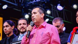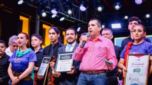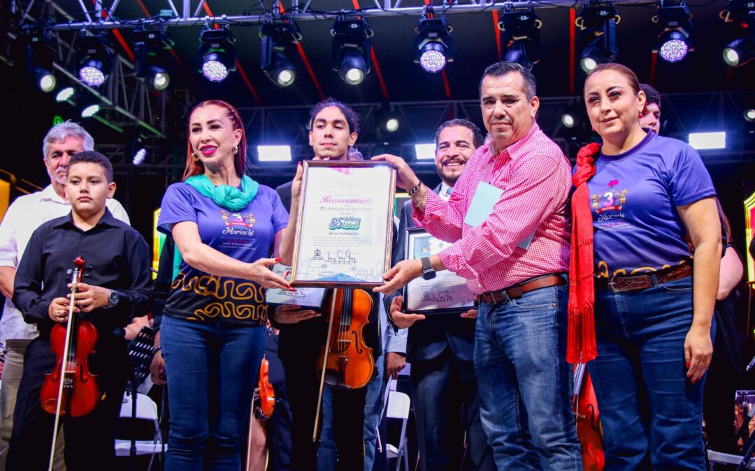 En el marco del 85 aniversario de la Universidad de Colima (UdeC), la presidenta municipal de Villa de Álvarez, Esther Gutiérrez Andrade, entregó un reconocimiento a la máxima casa de estudios del estado durante la tercera edición del Festival del Mariachi Villa de Álvarez, este martes 16 de septiembre en el Jardín Independencia.