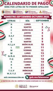 La secretaria de Bienestar, Ariadna Montiel Reyes, informó que, del 1 al 25 de septiembre, los derechohabientes y beneficiarios de las Pensiones y Programas para el Bienestar de las mujeres, adultos mayores, personas con discapacidad, madres trabajadoras y las y los sembradores, recibirán el pago correspondiente al bimestre septiembre–octubre.