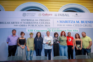 El pasado 23 de mayo se llevó a cabo la ceremonia de entrega del Premio Bellas Artes de Narrativa Colima para Obra Publicada 2024, otorgado a la escritora Maritza M. Buendía por su libro Cielo cruel. El evento se realizó en el marco de la Feria del Libro Altexto UdeC 2025 y fue presidido por el rector de la Universidad de Colima, Christian Torres Ortiz Zermeño, junto con Raquel Boetto Bárcena, subdirectora general del Instituto Nacional de Bellas Artes y Literatura (INBAL), en representación de la directora general del instituto, Alejandra de la Paz Nájera.