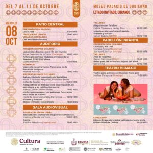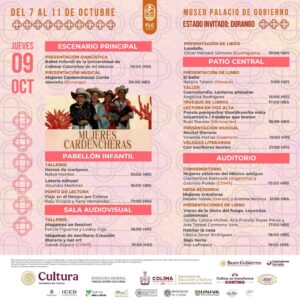 Y siendo Durango el estado invitado de esta edición de la Feria del Libro Colima, el Instituto de Cultura de esa entidad enriquecerá la cartelera con una gran delegación de artistas, escritoras y escritores duranguenses, como el cantautor Samuel Herrera y la agrupación Mujeres Cardencheras.