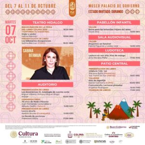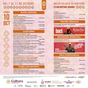 Y siendo Durango el estado invitado de esta edición de la Feria del Libro Colima, el Instituto de Cultura de esa entidad enriquecerá la cartelera con una gran delegación de artistas, escritoras y escritores duranguenses, como el cantautor Samuel Herrera y la agrupación Mujeres Cardencheras.