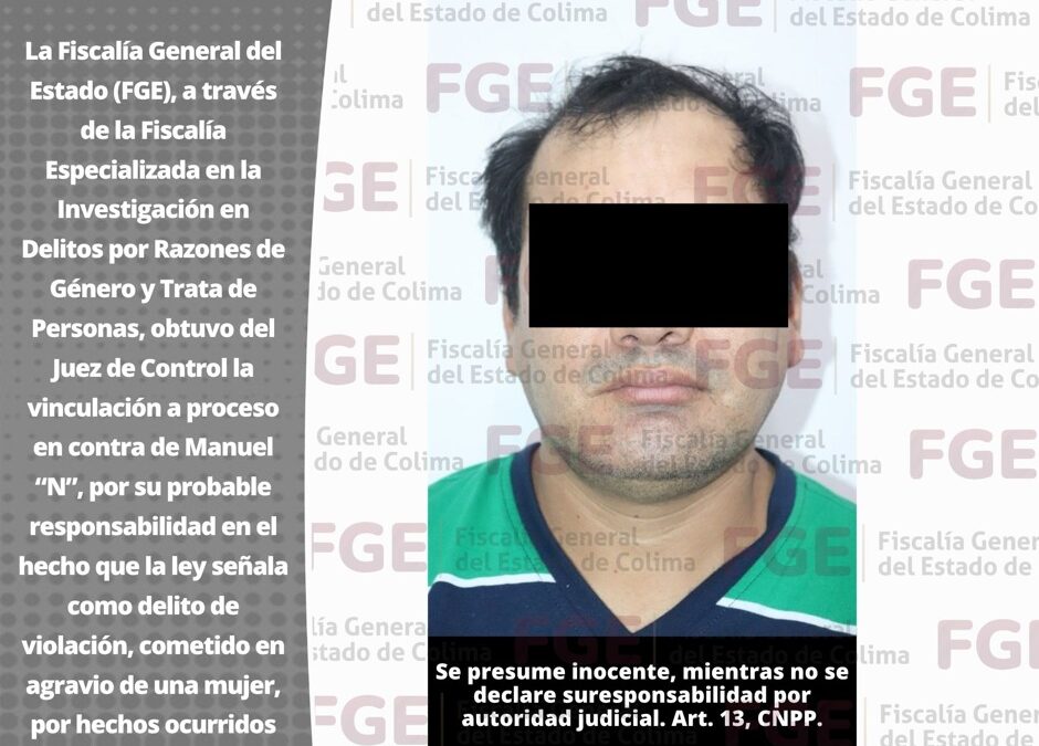 La Fiscalía General del Estado (FGE), a través de la Fiscalía Especializada en la Investigación en Delitos por Razones de Género y Trata de Personas, obtuvo del Juez de Control la vinculación a proceso en contra de Manuel “N”, por su probable responsabilidad en el hecho que la ley señala como delito de violación, cometido en agravio de una mujer, por hechos ocurridos en la colonia del Pacífico del municipio de Manzanillo.