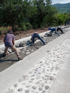 La obra incluye la aplicación de concreto hidráulico y empedrado, así como trabajos de mejoramiento de terreno que facilitan el tránsito vehicular y de maquinaria agrícola, impulsando la economía local y fortaleciendo la seguridad vial.