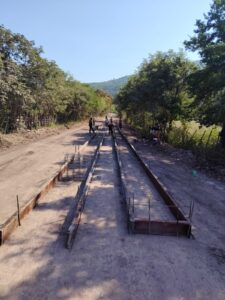 Los trabajos incluyen el mejoramiento del terreno natural, colocación de concreto hidráulico y empedrado ahogado en concreto, así como la construcción de cunetas en zonas de corte para optimizar el drenaje pluvial.