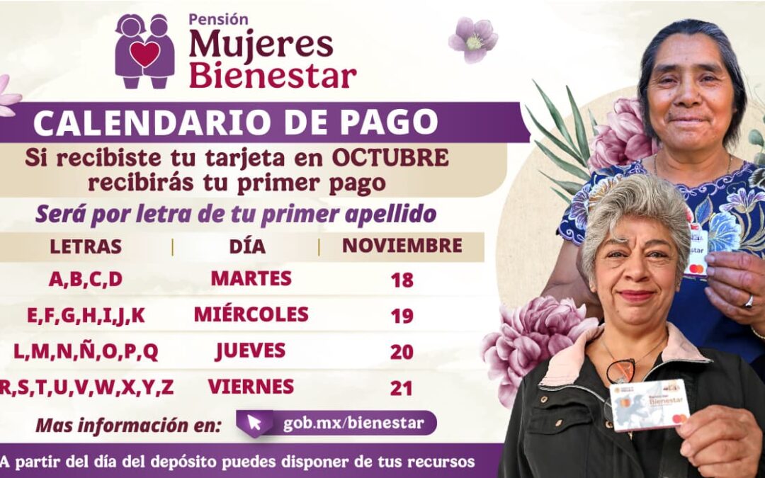 El Gobierno de México, a través de la Secretaría de Bienestar, informó que, del 18 al 21 de noviembre, las mexicanas de entre 60 y 64 años que se registraron en agosto a la Pensión Mujeres Bienestar y recibieron su tarjeta en octubre, se les otorgará su primer pago de este apoyo de 3 mil pesos bimestrales.