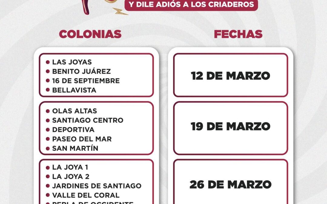 Las brigadas estarán presentes el 12 de marzo en Las Joyas, Benito Juárez, 16 de Septiembre y Bellavista; el 19 de marzo en Olas Altas, Santiago Centro, Deportiva, Paseo del Mar y San Martín; y el 26 de marzo en La Joya 1, La Joya 2, Jardines de Santiago, Valle del Coral y Perla de Occidente.