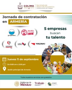 La Subsecretaría del Trabajo del Gobierno del Estado de Colima, en coordinación con el Servicio Nacional de Empleo (SNE), invita a la población a participar en las dos Jornadas de Contratación que se realizarán esta semana en los municipios de Armería y Colima, con el objetivo de acercar oportunidades laborales formales y estables a la ciudadanía.
