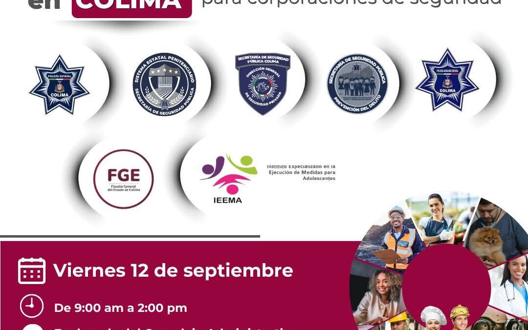 El viernes 12 de septiembre se llevará a cabo la siguiente Jornada de Contratación en Colima, dirigida a quienes deseen integrarse a corporaciones de seguridad. El evento se desarrollará en el Complejo Administrativo de Gobierno del Estado, de 9:00 de la mañana a 2:00 de la tarde, con la participación de la Fiscalía General del Estado, la Secretaría de Seguridad Pública, la Policía Estatal Preventiva, Policía Auxiliar y el Instituto Especializado en la Ejecución de Medidas para Adolescentes.