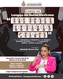 La diputada local Sharon Díaz García, impartirá un curso gratuito de Lengua de Señas Mexicana “Mis manos también hablan”, dirigido a trabajadoras y trabajadores del H. Congreso del Estado, así como personal de instituciones públicas de los tres niveles de Gobierno y público en general.
