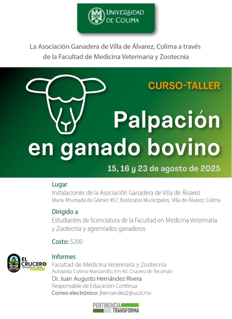 Con el objetivo de fortalecer las capacidades técnicas del sector ganadero y brindar formación práctica a sus estudiantes, la Asociación Ganadera Local de Villa de Álvarez, Colima, en coordinación con la Facultad de Medicina Veterinaria y Zootecnia (FMVZ) de la Universidad de Colima, impartirán el Curso “Palpación en Ganado Bovino” los días 15, 16 y 23 de agosto.