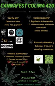Las otras actividades que se llevarán a cabo la tarde de este sábado que serán organizados por los colectivos MryMrs Bong, Morenabbis y Colectivo Área 420 de las 3 de la tarde a 8 de la noche de este sábado en el jardín Corregidora se llevará a cabo el Cannafest Colima 420, en el que habrá concierto de música, rock, rap y psytrance.