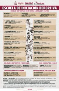 La Escuela de Iniciación Deportiva se ofrece de manera gratuita a la niñez y juventudes, salvo la natación en el Centro Acuático de Occidente; para más información sobre inscripciones y horarios, comunicarse al teléfono 312-395-6127 o acudir a la sede del Incode ubicado en avenida Camino Real No. 402, a un costado de la unidad deportiva ‘Morelos’, de 9:00 de la mañana a 5:00 de la tarde.