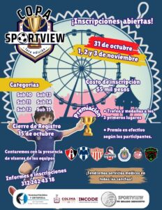 El Instituto Colimense del Deporte (Incode), en coordinación con la Promotora Deportiva Sportview organizarán la primera edición de la Copa Sportview de futbol, del jueves 31 de octubre al domingo 3 de noviembre, en las unidades deportivas ‘José María Morelos y Pavón” en Colima, y ‘Gustavo Alberto Vázquez Montes’ en Villa de Álvarez, estadio Colima y campo de El Chanal.