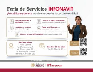 El INFONAVIT llevará a cabo su Feria de Servicios en Villa de Álvarez, Colima, el próximo martes 28 de abril, de 16:00 a 18:00 horas, con el fin de asesorar a las y los trabajadores interesados en obtener un crédito, además de ofrecer alternativas de pago a quienes enfrentan dificultades para cubrir sus mensualidades.