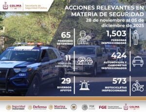 La Secretaría de Seguridad Pública (SSP) del Gobierno del Estado de Colima, en coordinación con personal operativo de la Secretaría de Marina Armada de México (Semar) y la Policía Estatal Preventiva (PEP), lograron la detención de 65 personas durante la semana del 28 de noviembre al 5 de diciembre, mediante la ‘Operación Coliman’, que tiene el objetivo de disminuir la incidencia delictiva en colonias que presentan registros de delitos de alto impacto, violencia y robo.