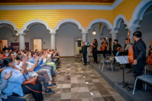 Simone Iannarelli, director general del festival y catedrático del IUBA, recordó que Guitarromanía nació hace 20 años con la ilusión de convertir a Colima en un semillero de talentos locales y nacionales. “Eso sólo era posible con un evento como éste, que ha traído a invitados de más de 30 países. Gracias a la visión institucional de apostar por el arte a largo plazo, el festival ha logrado consolidarse. Agradezco profundamente al rector por su respaldo”.