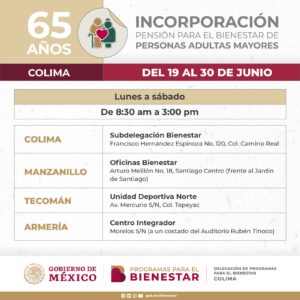 Los Módulos de Atención que estarán funcionando desde hoy y hasta el 30 de junio, son los siguientes: oficinas de la Subdelegación de Bienestar en la ciudad de Colima, ubicadas en la calle Francisco Hernández Espinoza 120, col. Camino Real; oficinas de Bienestar en Manzanillo, con domicilio en Arturo Meillón 18, Santiago; Unidad Deportiva Norte, en Tecomán, por la Av. Mercurio S/N; y en el Centro Integrador de Armería, en calle Morelos S/N.