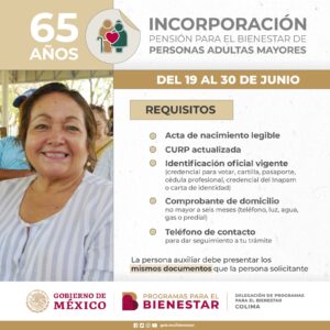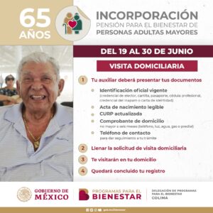 Esta mañana inició el registro de incorporación a la Pensión para el Bienestar de las Personas Adultas Mayores de las y los colimenses que cumplen 65 años entre los meses de mayo y junio, así como de quienes ya los tienen, informó la delegada de Programas para el Bienestar en Colima, Viridiana Valencia Vargas.