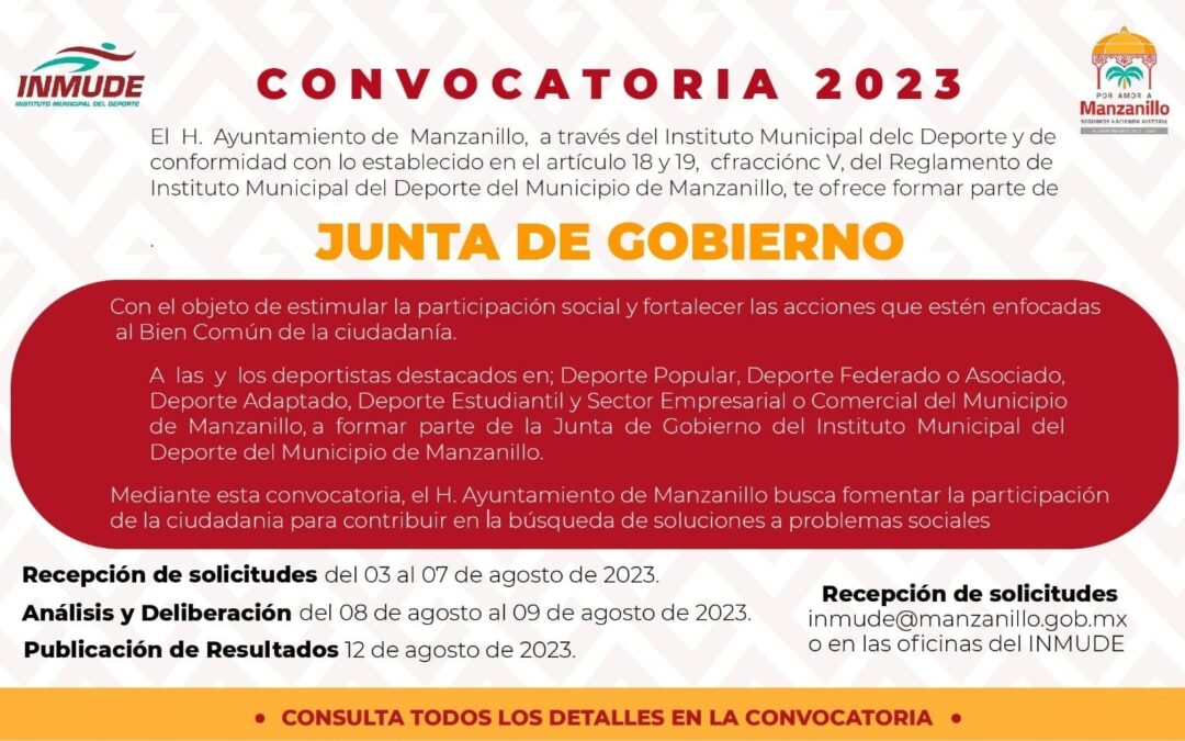 Con el objetivo de fomentar la participación de la población y contribuir al bien común, el Ayuntamiento de Manzanillo, a través del Instituto Municipal del Deporte (INMUDE), convoca a deportistas a formar parte de su Junta de Gobierno.