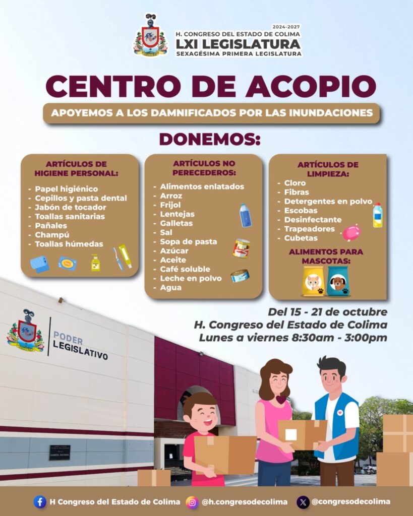 El Congreso del Estado de Colima, instaló un centro de acopio para reunir víveres y artículos de primera necesidad, que serán enviados a las familias afectas por las recientes inundaciones en varios estados del país.