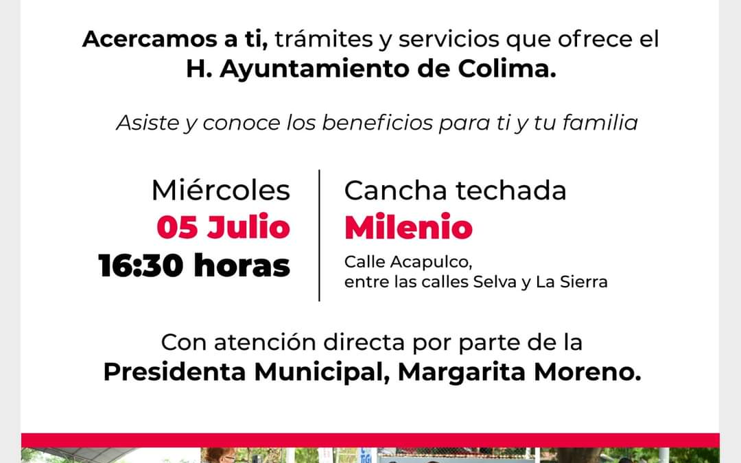 La presidenta municipal de Colima, Margarita Moreno, invitó a la población a acudir al Ayuntamiento Móvil, el cual se realizará este miércoles 5 de julio, a partir de las 4 de la tarde, en la cancha techada de la colonia Nuevo Milenio.