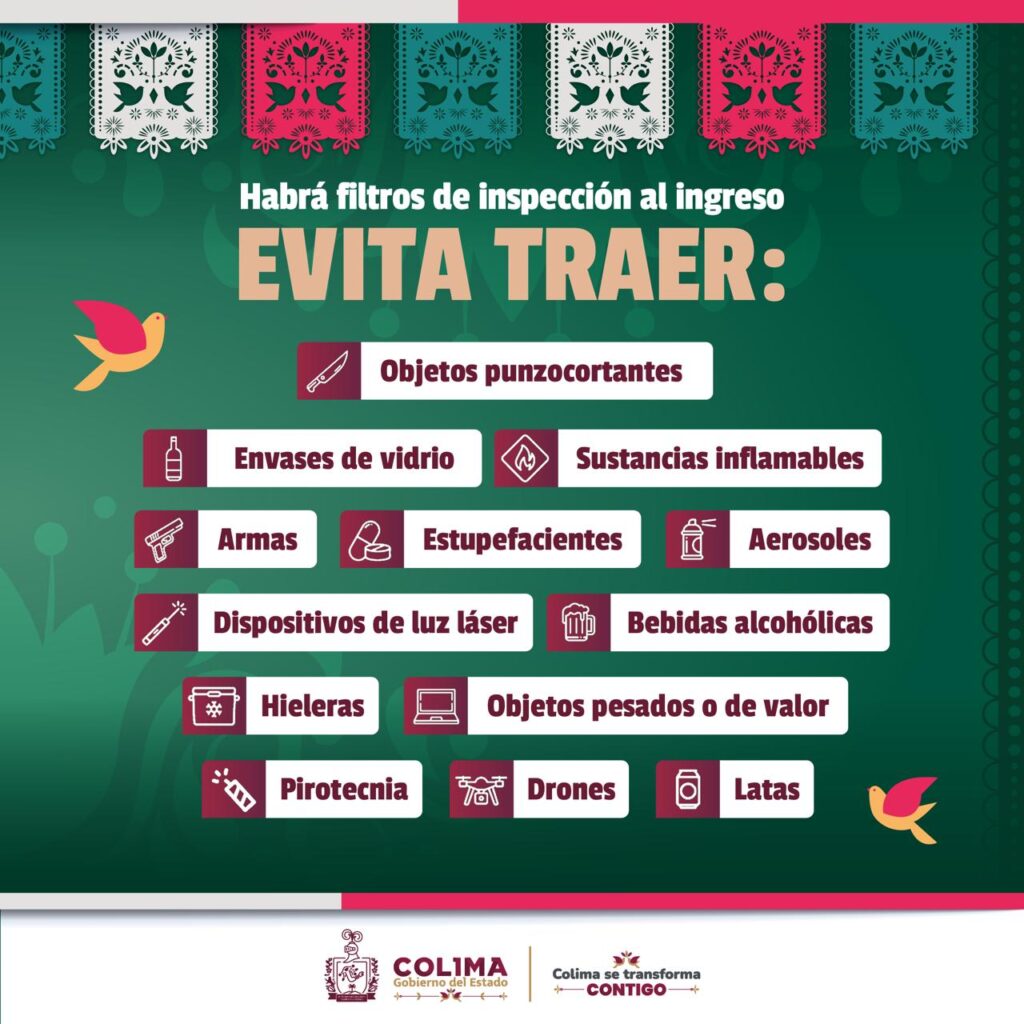 Otras recomendaciones a considerar para asistir al evento, son la colocación de filtros de inspección para entrar al mismo, pues no se permitirá el ingreso de objetos punzocortantes, envases de vidrio, armas, dispositivos de luz láser, hieleras, pirotecnia, sustancias inflamables o ilegales, aerosoles, bebidas alcohólicas, objetos pesados o de valor, drones y latas. Tampoco se permitirá el sobrevuelo de drones en toda la zona del festejo.