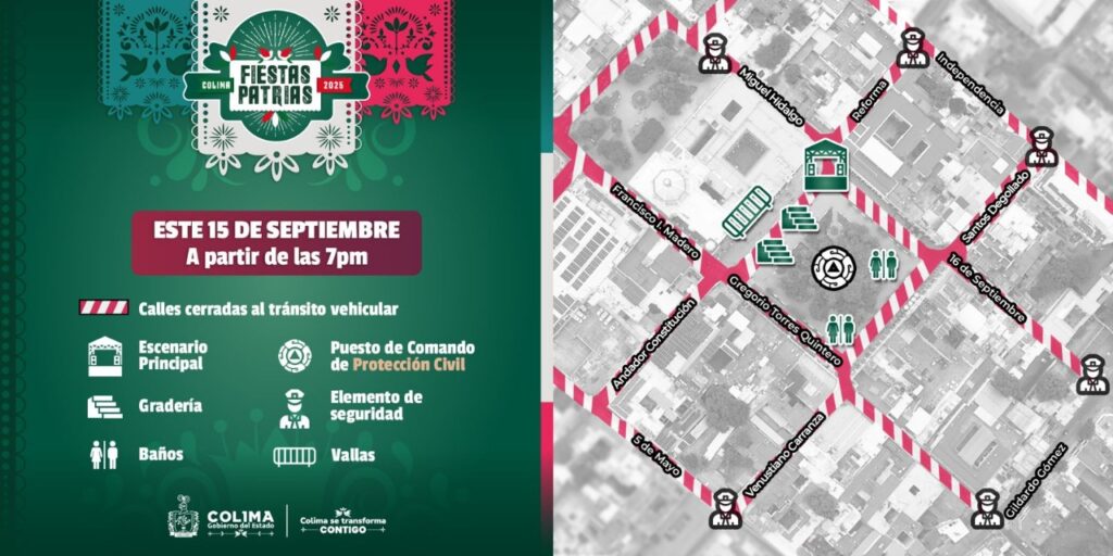 También se debe tomar en cuenta que desde las 16:00 horas iniciará el cierre de vialidades aledañas a la zona del festejo, como las calles 5 de Mayo, Venustiano Carranza, Gregorio Torres Quintero, Santos Degollado, 16 de Septiembre, Independencia, Reforma, Francisco I. Madero, Miguel Hidalgo y Medellín.