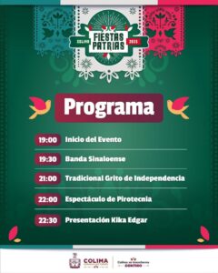 La venta de antojitos comenzará a las 19:00 horas, la música en vivo con la presentación de una banda estilo sinaloense iniciará media hora después, mientras que el protocolo del Grito será a las 9:00 de la noche y el concierto de Kika Edgar estará iniciando alrededor de las 10:30 de la noche.