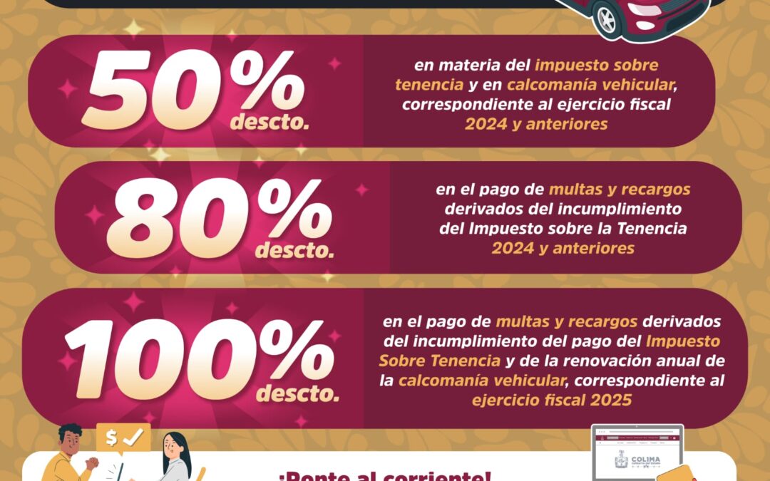 El Gobierno del Estado de Colima, a través de la Secretaría de Planeación, Finanzas y Administración (Seplafina), informa a la ciudadanía que, con el objetivo de apoyar la economía de las familias colimenses y fomentar el cumplimiento de las obligaciones fiscales, se han aprobado una serie de estímulos fiscales dirigidos a personas físicas y morales tenedoras o usuarias de vehículos registrados en el Registro Público Vehicular (Repuve) de esta entidad; dichos beneficios vencen este 23 de diciembre y son los siguientes: