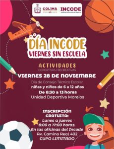 Tras la buena aceptación por parte de madres y padres de familia, el Gobierno del Estado de Colima, a través del Instituto Colimense del Deporte (Incode), llevará a cabo nuevamente el ‘Día Incode, Viernes sin Escuela’, donde se ofrecen gratuitamente actividades deportivas y recreativas a niñas y niños de 6 a 12 años de edad este próximo viernes 28 de noviembre, día que la Secretaría de Educación y Cultura realiza el Consejo Técnico Escolar (CTE).