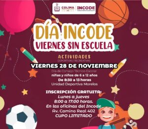 Tras la buena aceptación por parte de madres y padres de familia, el Gobierno del Estado de Colima, a través del Instituto Colimense del Deporte (Incode), llevará a cabo nuevamente el ‘Día Incode, Viernes sin Escuela’, donde se ofrecen gratuitamente actividades deportivas y recreativas a niñas y niños de 6 a 12 años de edad este próximo viernes 28 de noviembre, día que la Secretaría de Educación y Cultura realiza el Consejo Técnico Escolar (CTE).