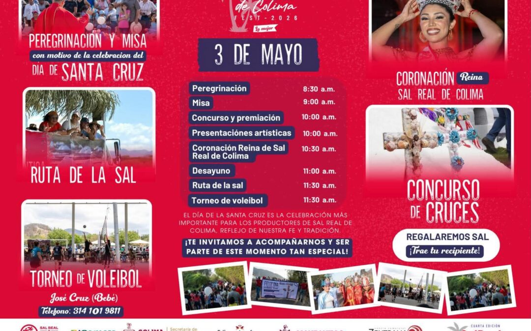 Con el objetivo de preservar las tradiciones, fortalecer el turismo comunitario y promover la riqueza cultural del estado, la empresa Sal Real de Colima anunció la realización del Festival de la Cruz 2026, que se llevará a cabo del 3 al 6 de mayo en las instalaciones de la salinera ubicadas sobre la carretera libre Manzanillo-Armería.