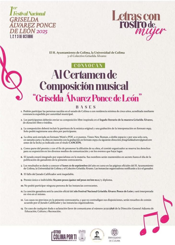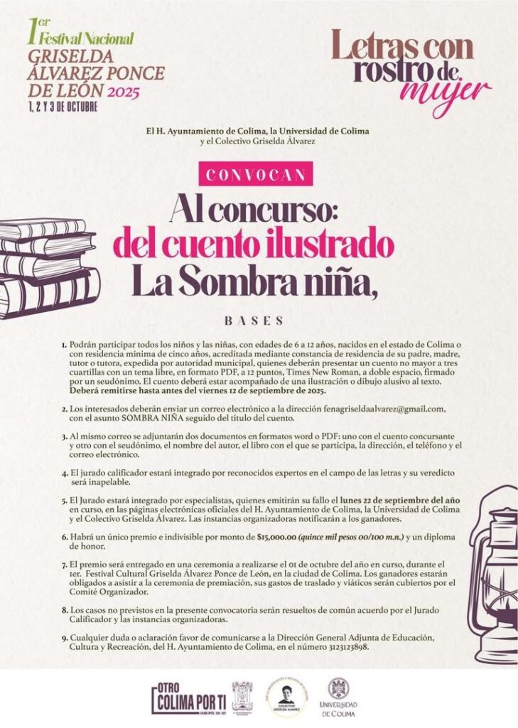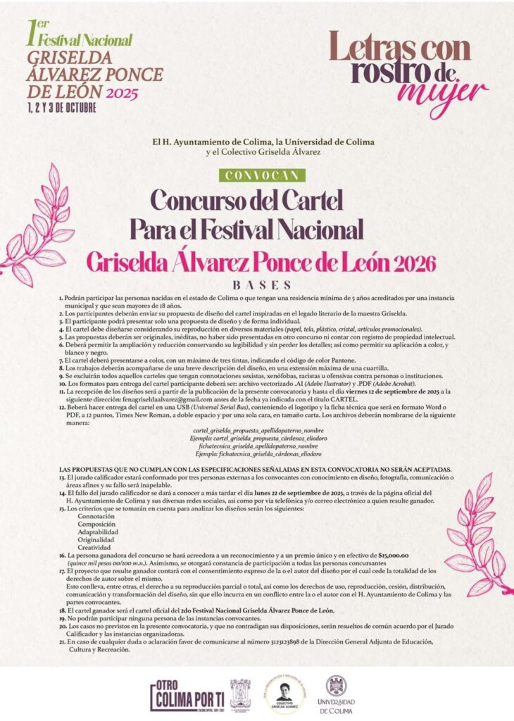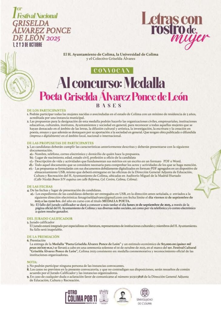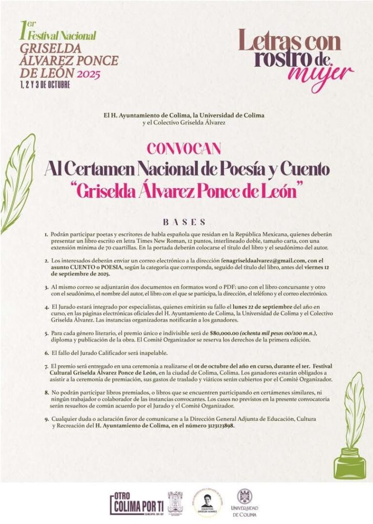 En el marco del Primer «Festival Nacional Griselda Álvarez Ponce de León 2025», la Universidad de Colima invita a la población en general a participar en las distintas convocatorias literarias y artísticas con motivo de dicho evento.