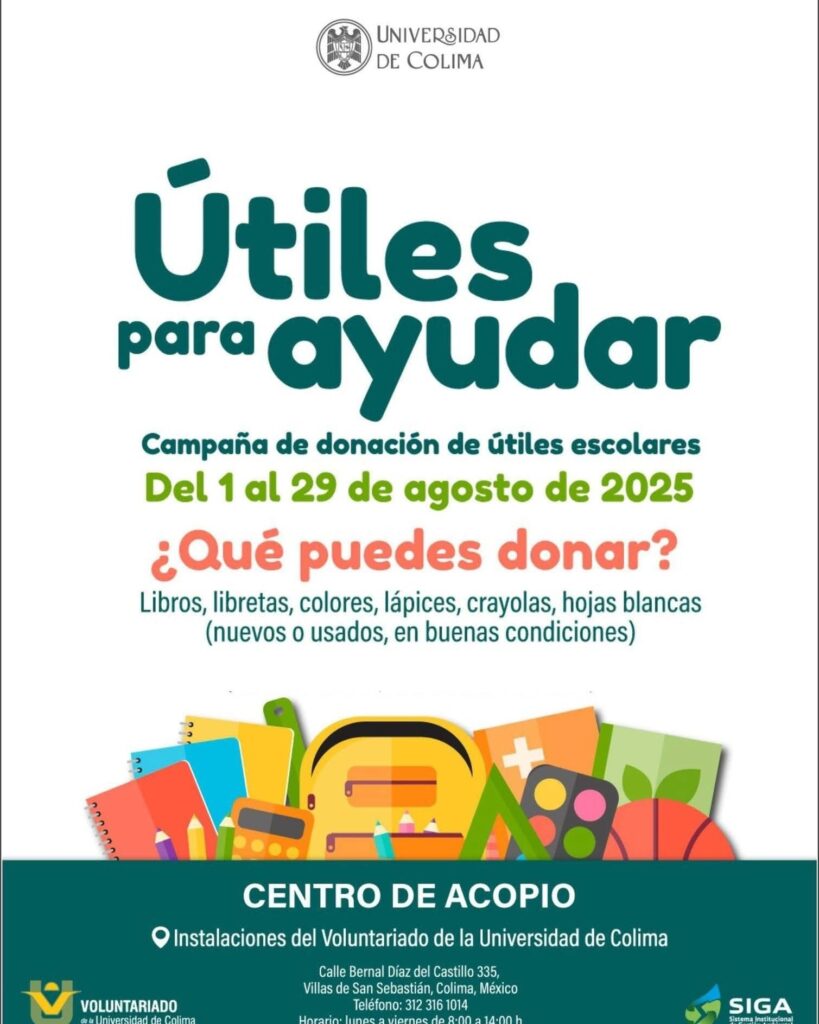 Con el propósito de apoyar a niñas, niños y jóvenes en situación vulnerable en este regreso a clases, el Voluntariado de la Universidad de Colima puso en marcha la campaña “Útiles para ayudar”, vigente del 1 al 29 de agosto de 2025.