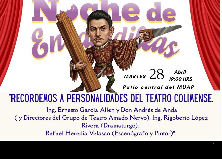 Bajo el título “Recordemos a personalidades del teatro colimense”, el encuentro rendirá homenaje a figuras que marcaron el desarrollo de las artes escénicas en el estado, como el Ing. Ernesto García Allen y Don Andrés de Anda, fundadores del Grupo Amado Nervo; el dramaturgo Ing. Rigoberto López Rivera, y el pintor y escenógrafo Rafael Heredia Velasco.