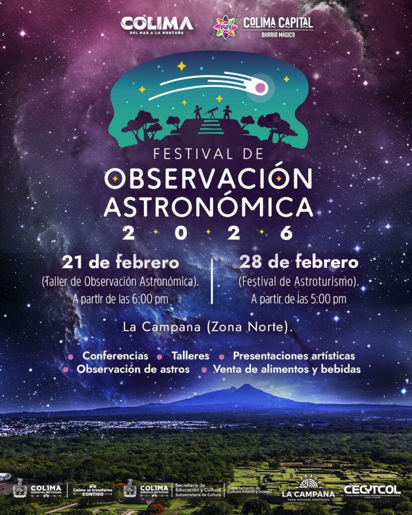 Con el objetivo de acercar la ciencia y la astronomía a la población en un entorno natural y familiar, el Gobierno del Estado de Colima que preside la gobernadora Indira Vizcaíno Silva, a través del Consejo Estatal de Ciencia y Tecnología, en coordinación con las subsecretarías de Cultura y de Turismo, invita al Festival de Observación Astronómica, que se llevará a cabo los sábados 21 y 28 de febrero, en el Parque Ecológico ‘La Campana’, en la zona norte.