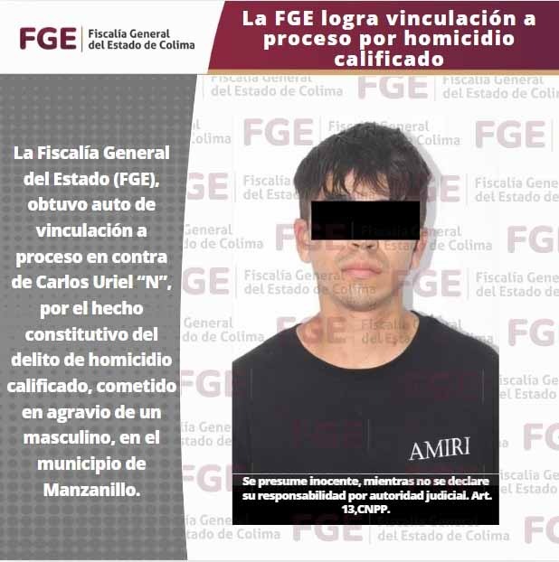 La Fiscalía General del Estado (FGE), obtuvo auto de vinculación a proceso en contra de Carlos Uriel “N”, por el hecho constitutivo del delito de homicidio calificado, cometido en agravio de un masculino, en el municipio de Manzanillo.