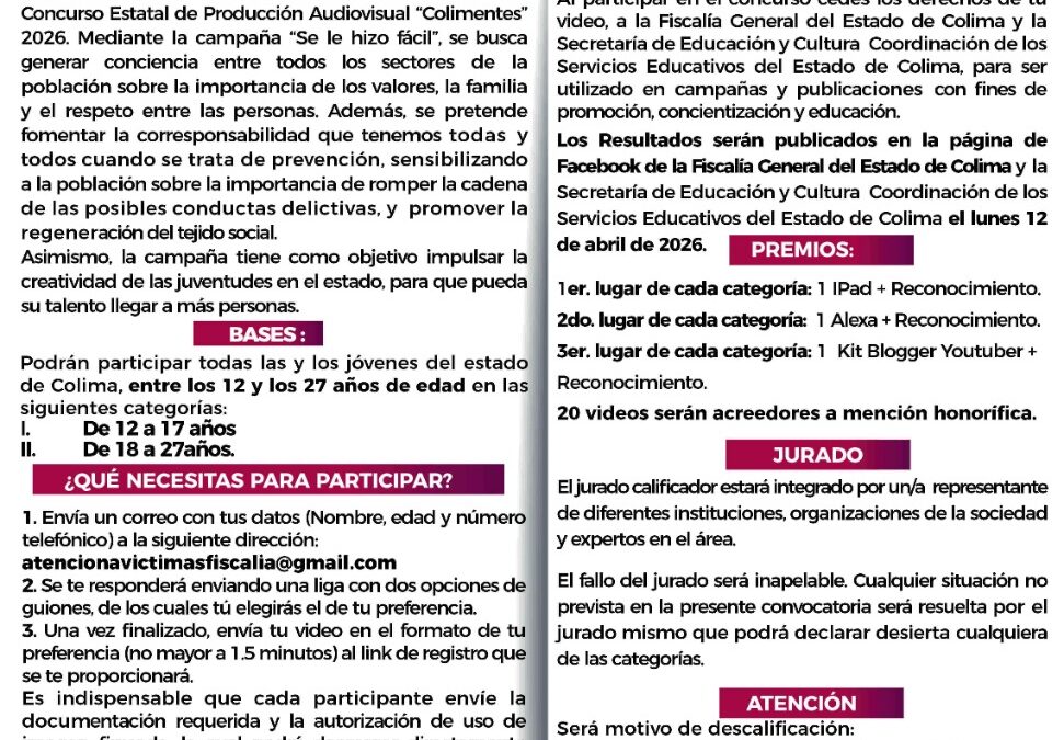 Convencidos de que la prevención del delito comienza con la participación activa de las y los jóvenes, la Fiscalía General del Estado de Colima (FGE), en coordinación con la Secretaría de Educación y Cultura, presentó el 1er. Concurso Estatal de Producción Audiovisual “Colimentes” 2026, una iniciativa que apuesta por el talento juvenil como motor de transformación social.