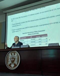 Alfonso Ramírez analizó los principales retos y proyecciones del paquete económico presupuestal que se discutió para 2026. Explicó los elementos clave que integran el análisis legislativo del presupuesto y abordó temas como el crecimiento económico –estimado entre 1.8 % y 2.8 % para el próximo año–, la inflación proyectada, el precio del petróleo y el déficit público, factores que, dijo, “sostienen el funcionamiento del estado mexicano”.